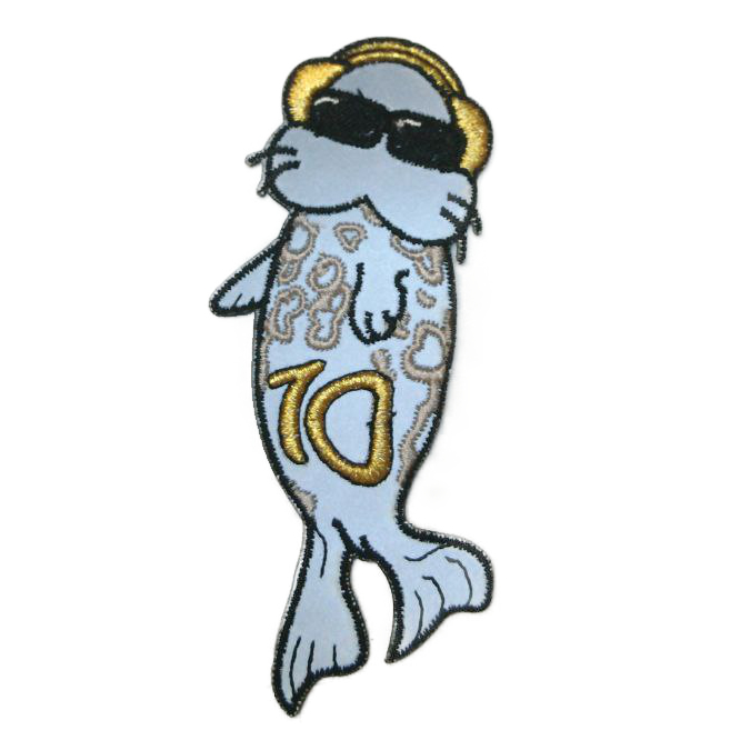 Loppuunmyyty! Vanhanmallinen heijastava norppamerkki. Merkki vaipui lopullisesti unholaan kiltojen ja ainejärjestöjen määrän kasvaessa ja korvattiin “Loistavia juontajia” -merkillä.